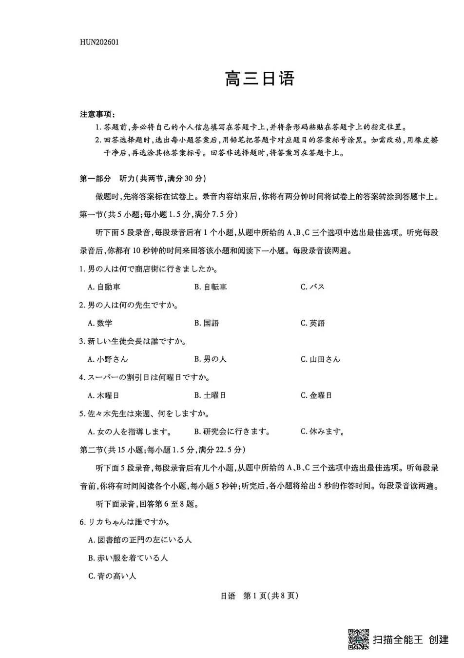 湖南省2025-2026学年高三上学期1月期末考试 日语.pdf