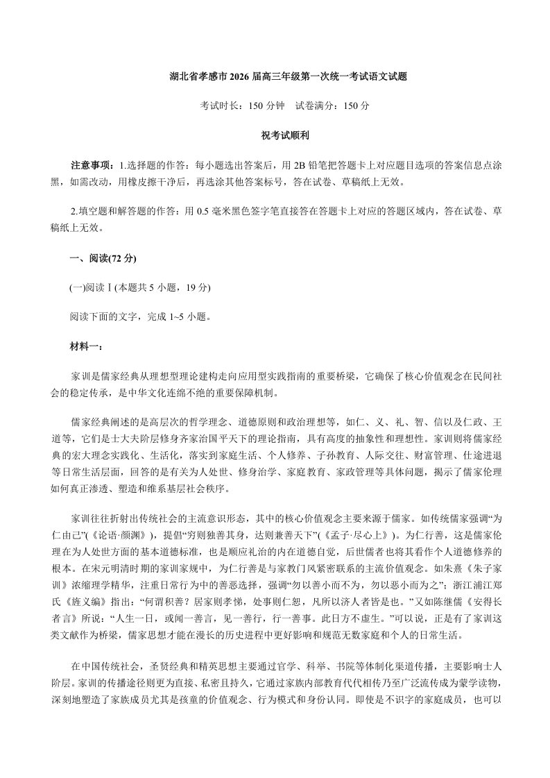 孝感市2026届高三年级第一次统一考试 语文试题(含答案).docx