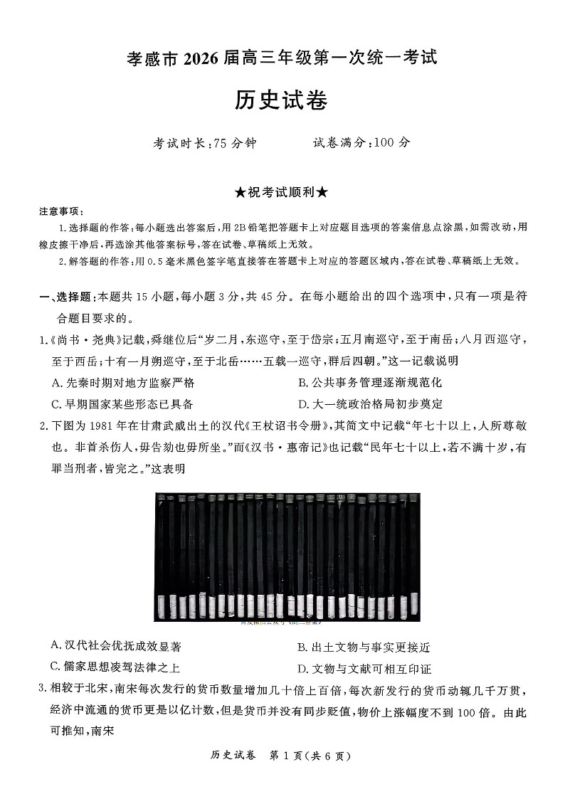 孝感市2026届高三年级第一次统一考试 历史试题(含答案).pdf