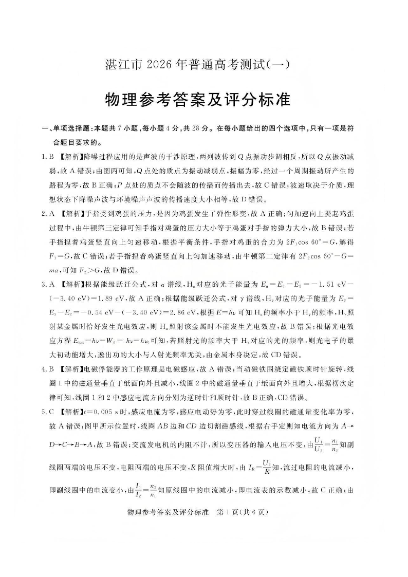 湛江市2026年普通高考测试(一)物理答案.pdf