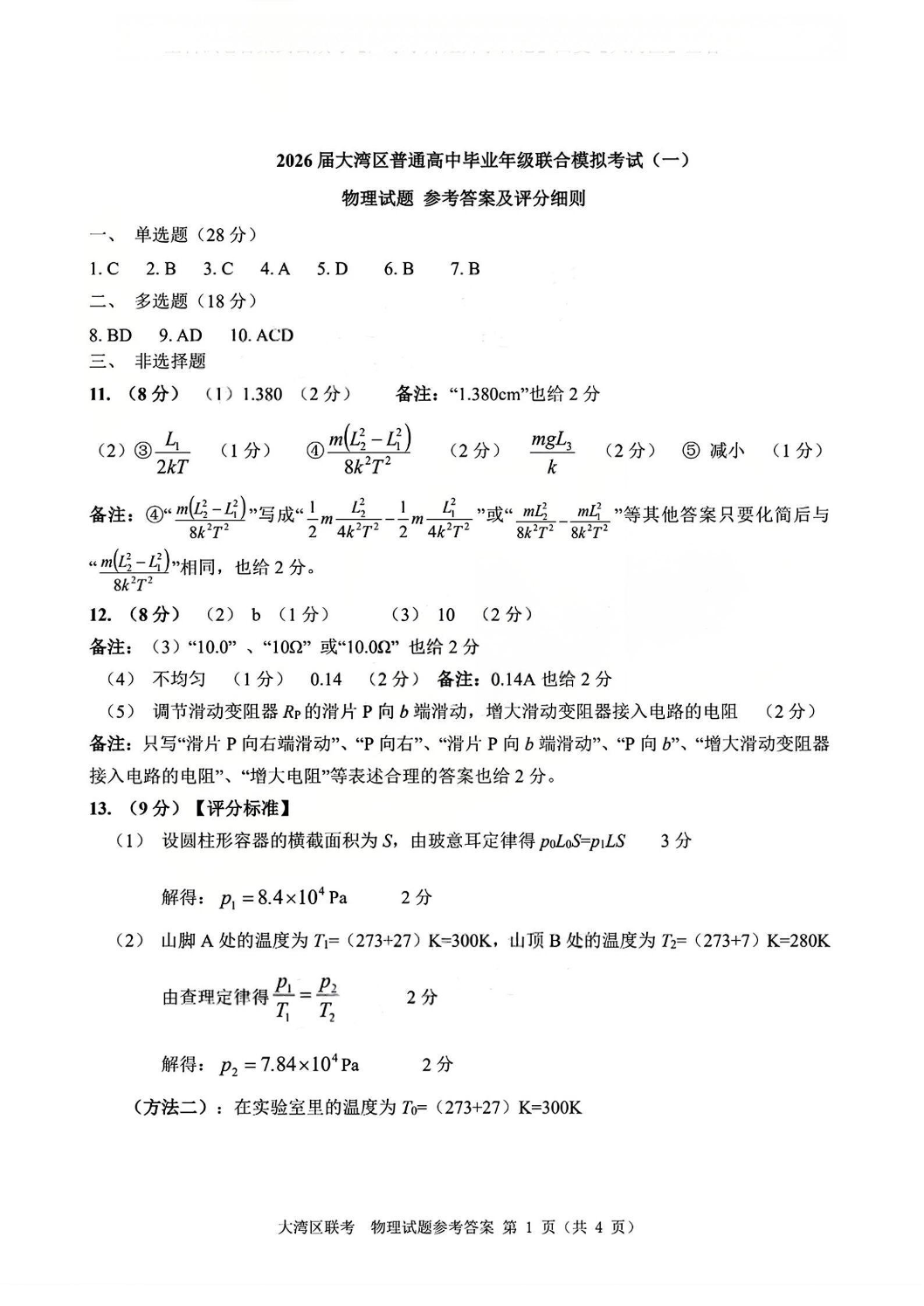 2026届大湾区普通高中毕业年级联合模拟考试(一)物理答案.pdf