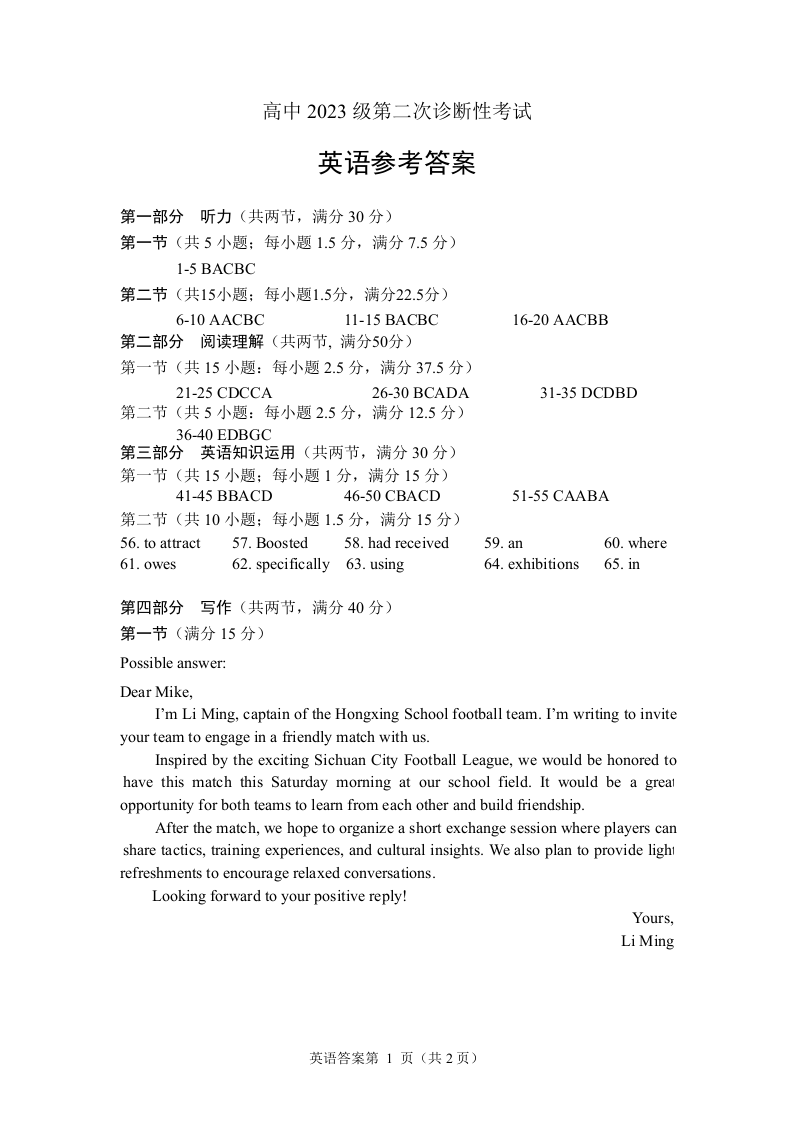 绵阳市高中2023级第二次诊断性考试 英语答案.docx