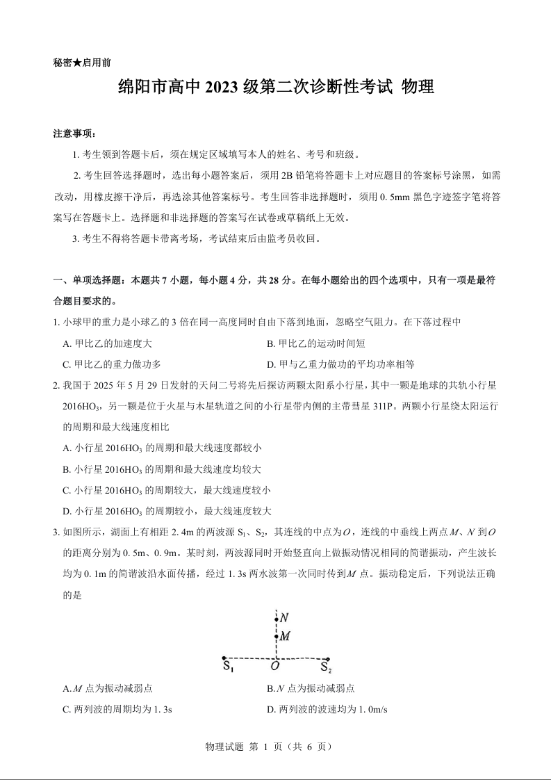 绵阳市高中2023级第二次诊断性考试 物理.docx