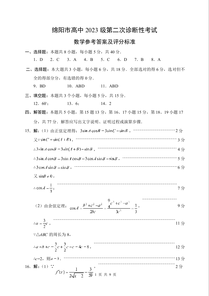 绵阳市高中2023级第二次诊断性考试 数学答案.docx