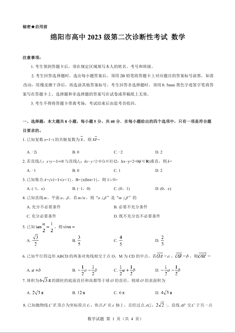 绵阳市高中2023级第二次诊断性考试 数学.docx
