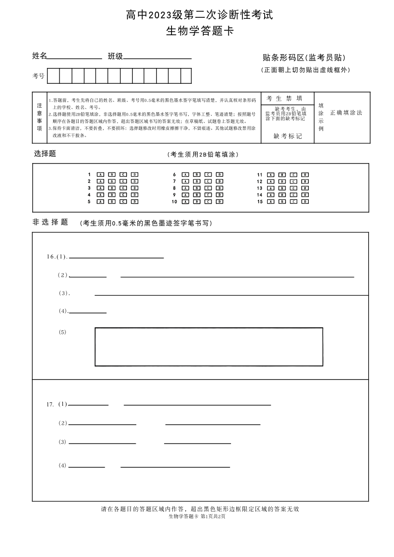 绵阳市高中2023级第二次诊断性考试 生物答题卡.pdf