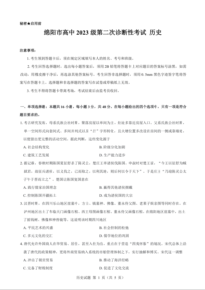 绵阳市高中2023级第二次诊断性考试 历史.docx