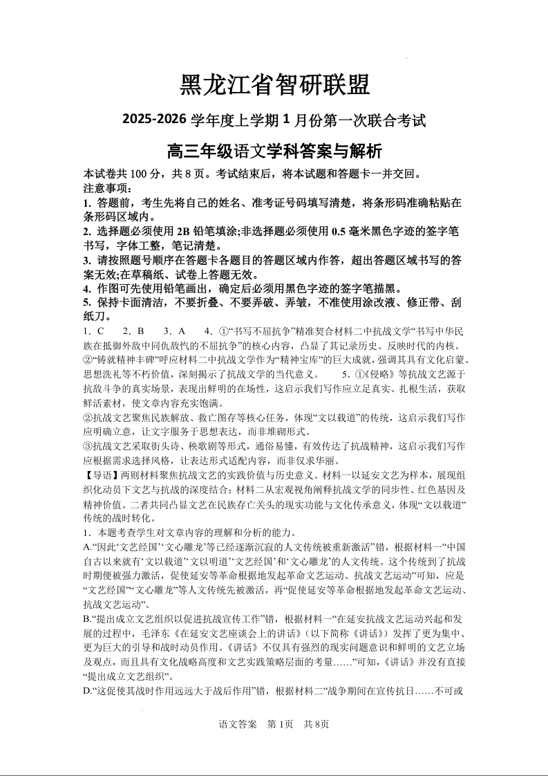 黑龙江省智研联盟2026届高三上学期1月份第一次联合考试 语文答案.docx