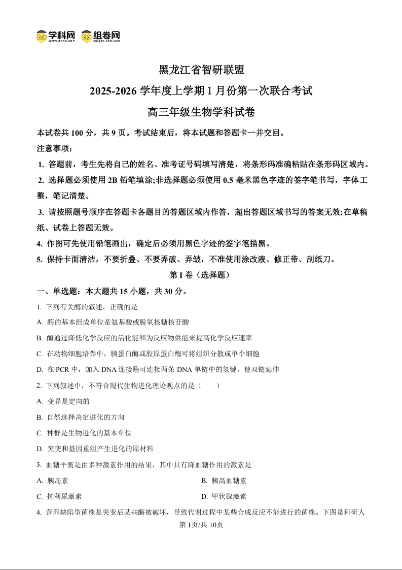 黑龙江省智研联盟2026届高三上学期1月份第一次联合考试 生物.docx