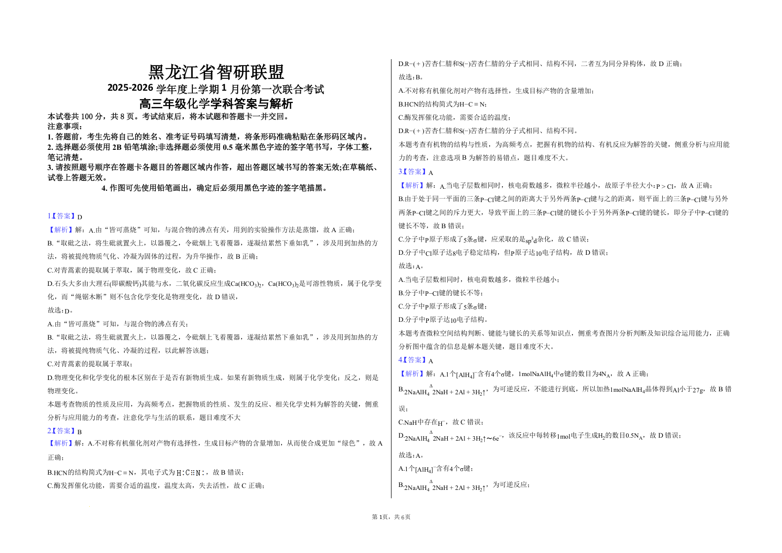 黑龙江省智研联盟2026届高三上学期1月份第一次联合考试 化学答案.docx
