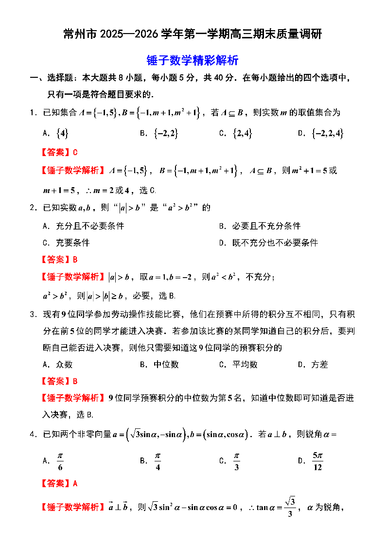 江苏省常州市2025-2026学年第一学期高三年级期末质量调研 数学答案.pdf
