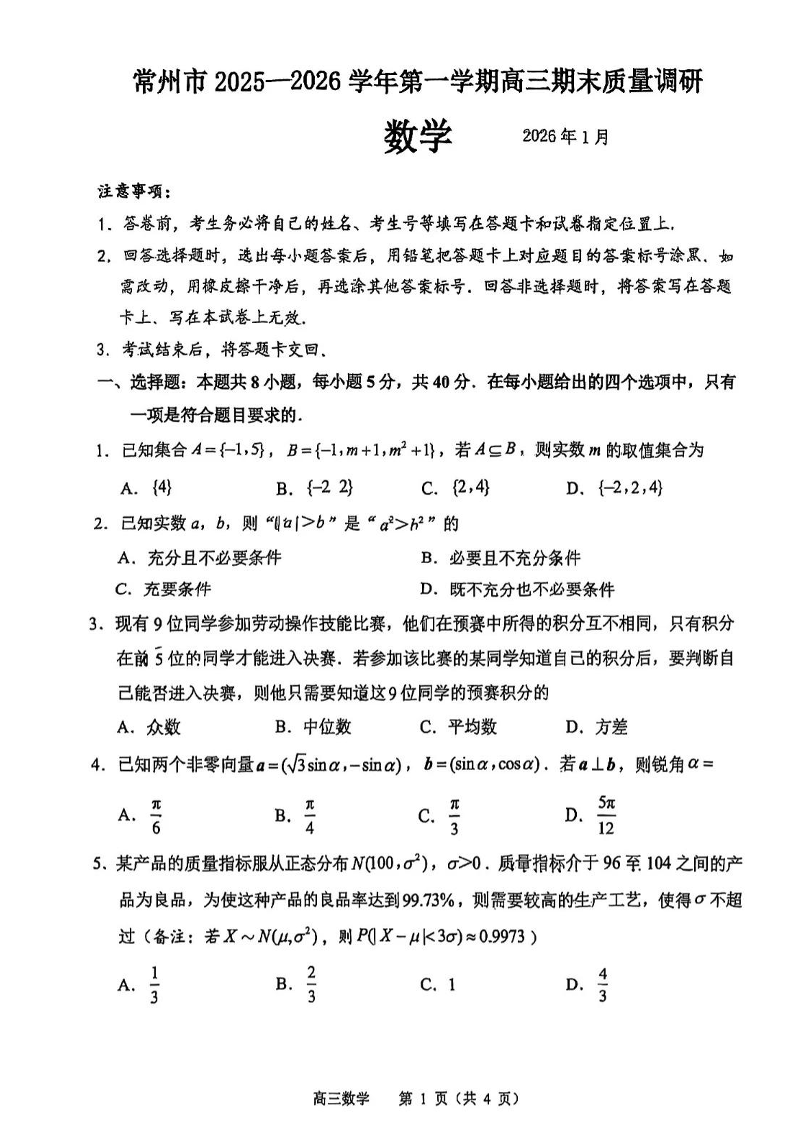 江苏省常州市2025-2026学年第一学期高三年级期末质量调研 数学.pdf