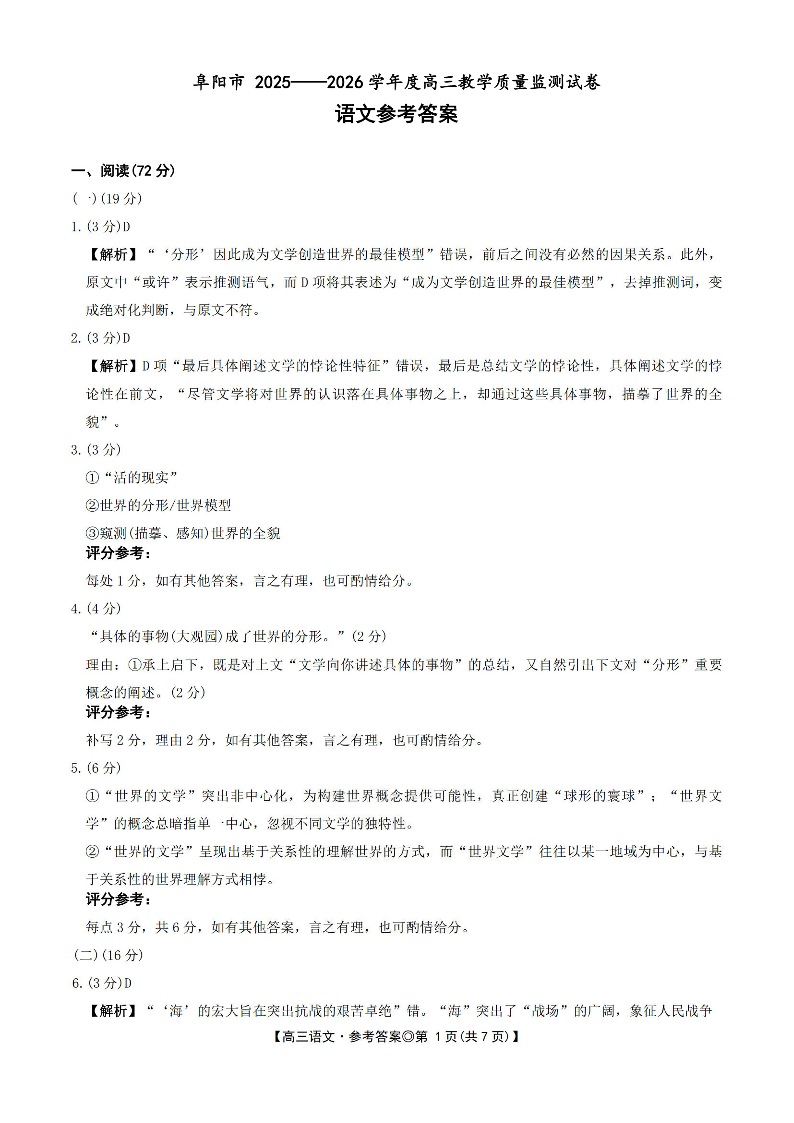 安徽省阜阳市2025-2026学年度高三教学质量监测试卷 语文答案.pdf