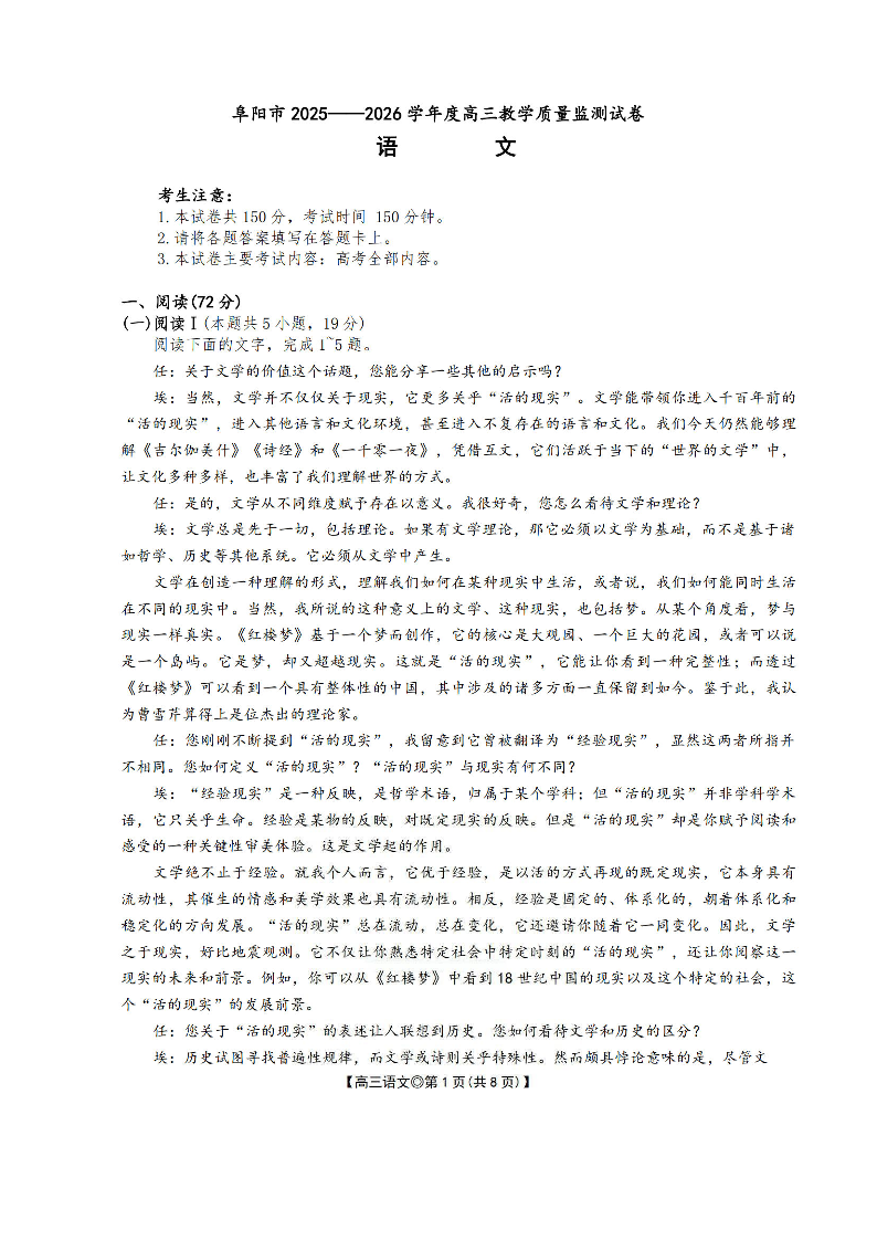 安徽省阜阳市2025-2026学年度高三教学质量监测试卷 语文.pdf