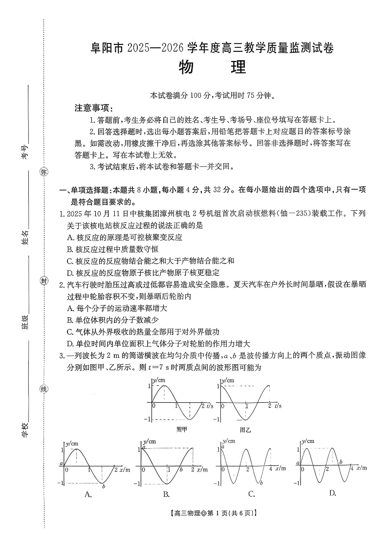 安徽省阜阳市2025-2026学年度高三教学质量监测试卷 物理.pdf