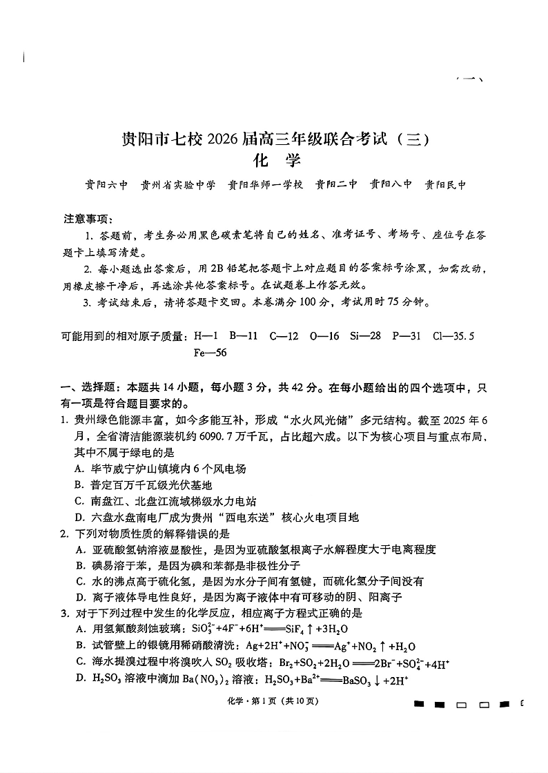 贵阳市七校2026届高三年级联合考试(三)化学.pdf