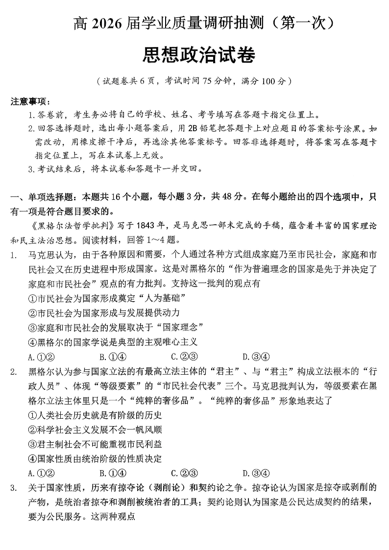 九龙坡区高2026届学业质量调研抽测(第一次)政治.pdf