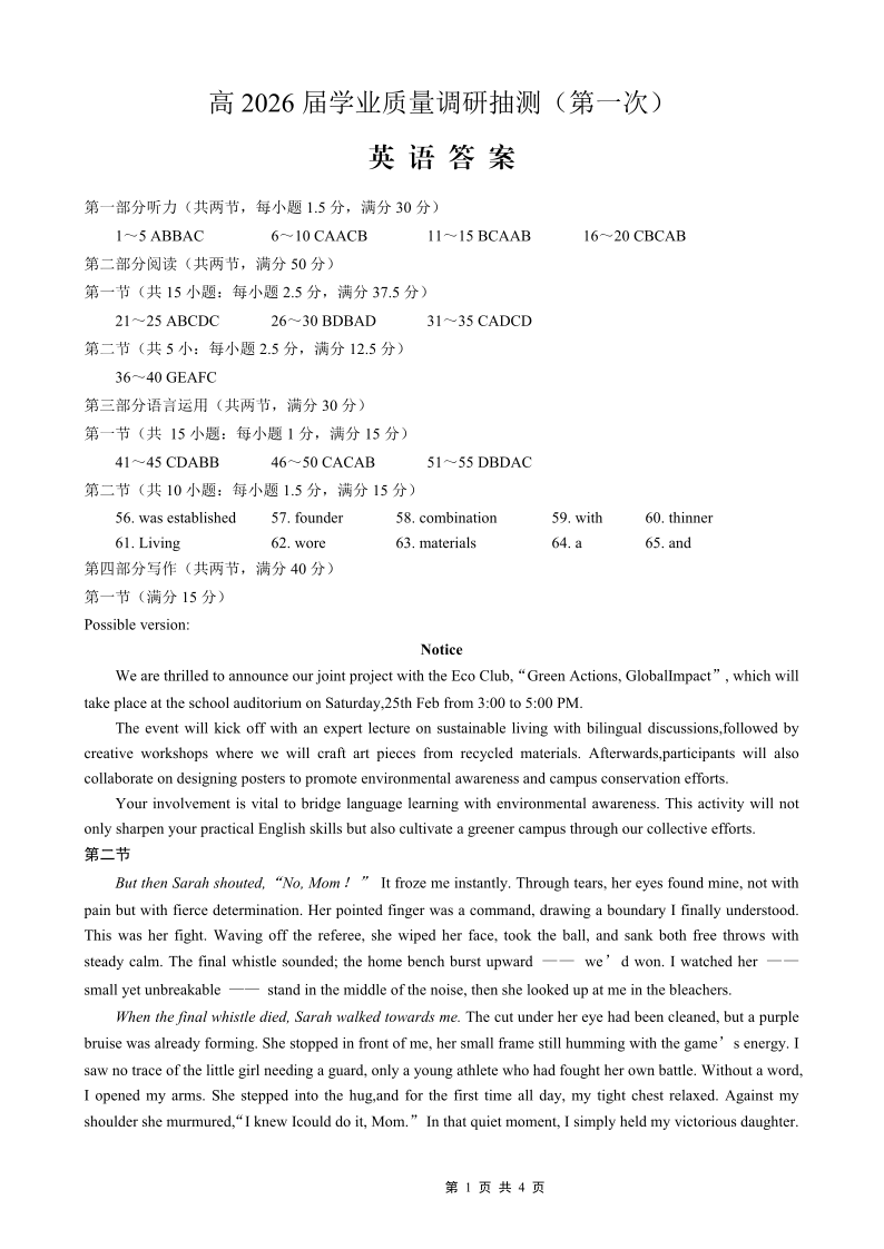 九龙坡区高2026届学业质量调研抽测(第一次)英语答案.pdf