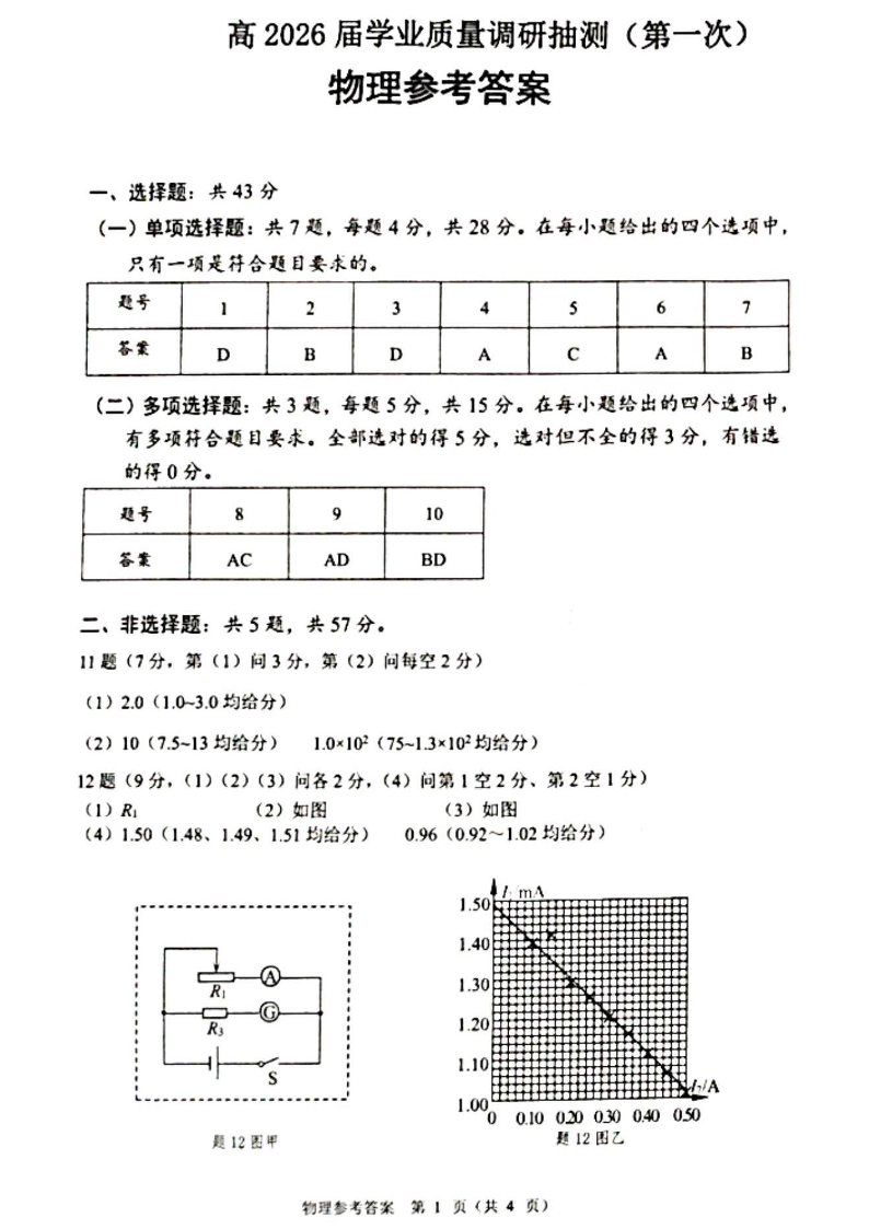 九龙坡区高2026届学业质量调研抽测(第一次)物理答案.pdf