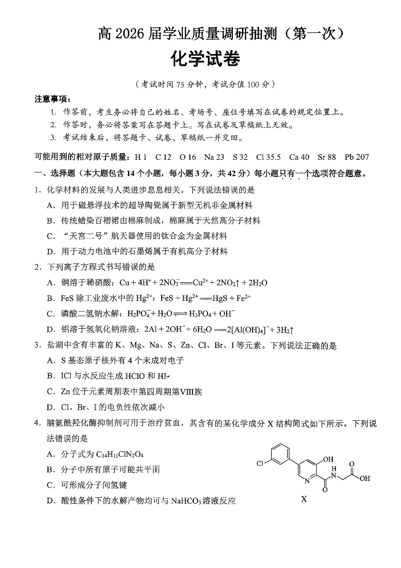 九龙坡区高2026届学业质量调研抽测(第一次)化学.pdf