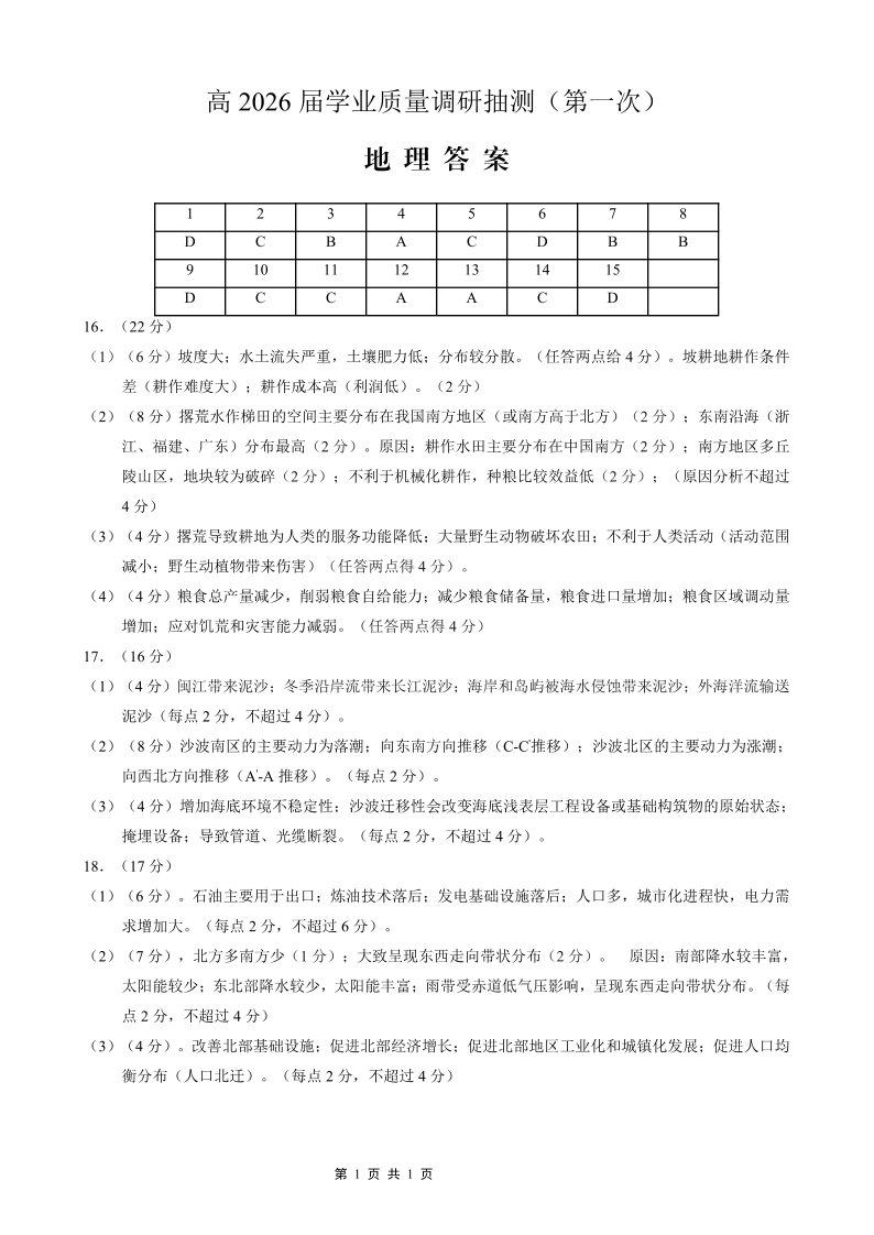 九龙坡区高2026届学业质量调研抽测(第一次)地理答案.pdf