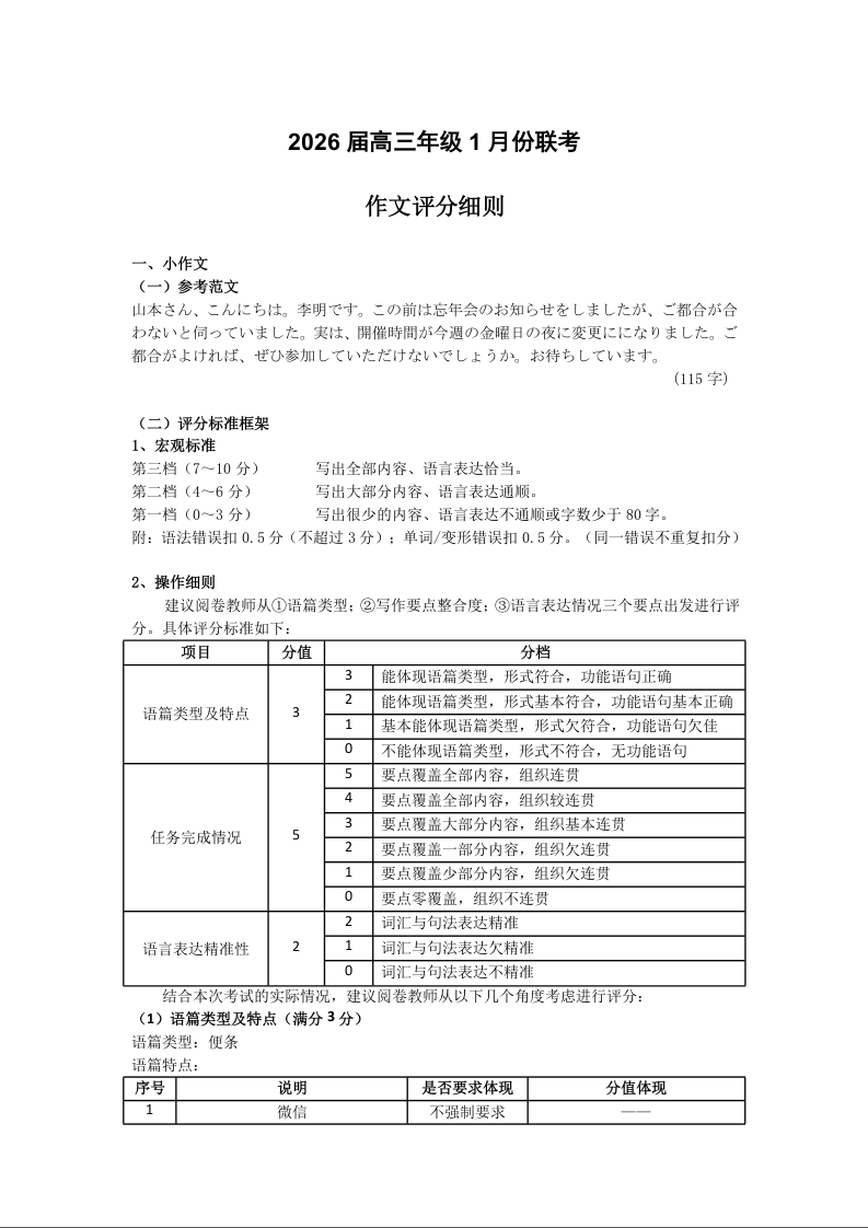 广东省衡水金卷2026届高三年级1月份适应性测试 日语作文评分标准.docx