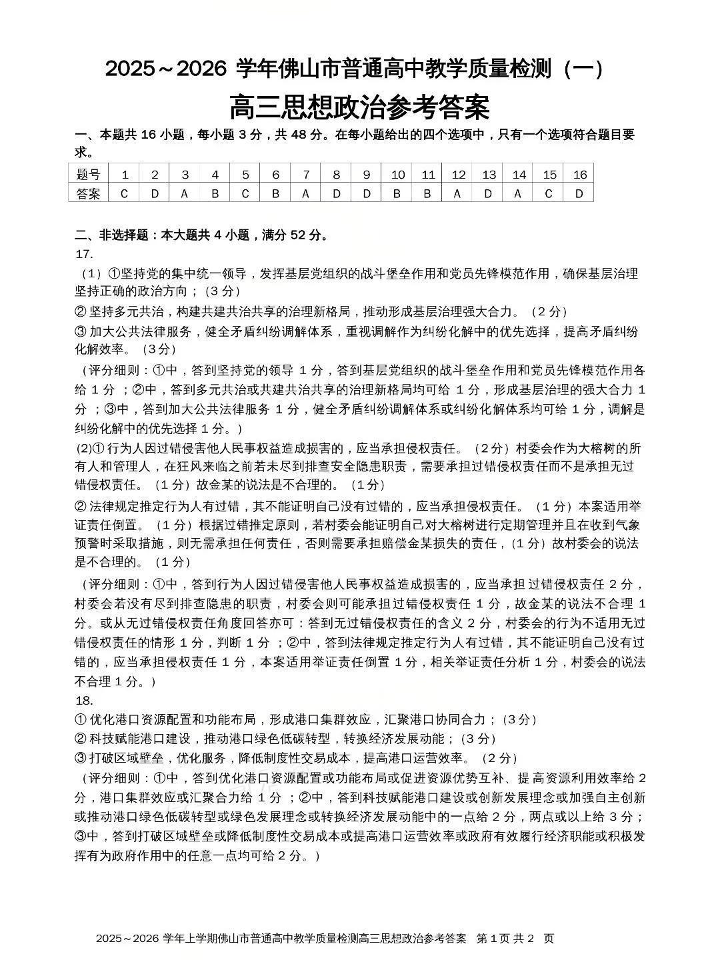 佛山市2025~2026学年佛山市普通高中教学质量检测(一)政治答案.pdf
