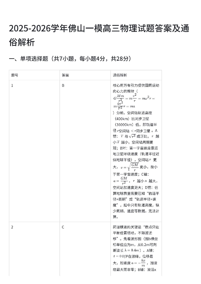 佛山市2025~2026学年佛山市普通高中教学质量检测(一)物理答案.pdf