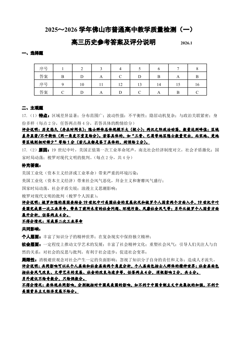 佛山市2025~2026学年佛山市普通高中教学质量检测(一)历史答案.pdf