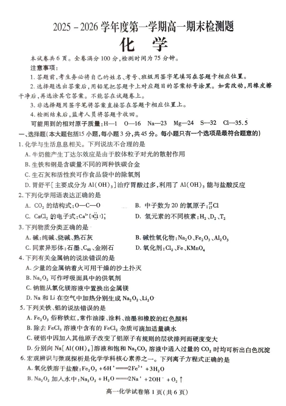 内江市2025-2026学年度第一学期高一期末检测题 化学.pdf