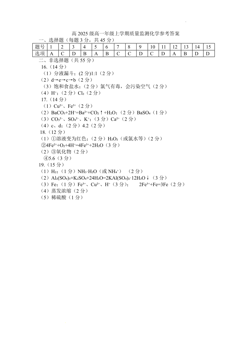 泸州市高2025级高一年级上学期期末质量监测试题 化学答案.pdf