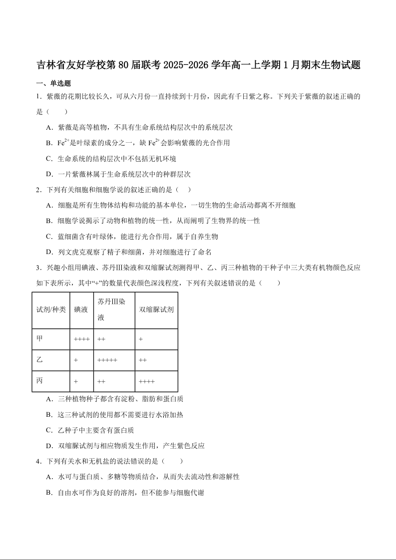 吉林省友好学校第八十届2025-2026学年高一上学期1月期末联考 生物试题(含答案).docx