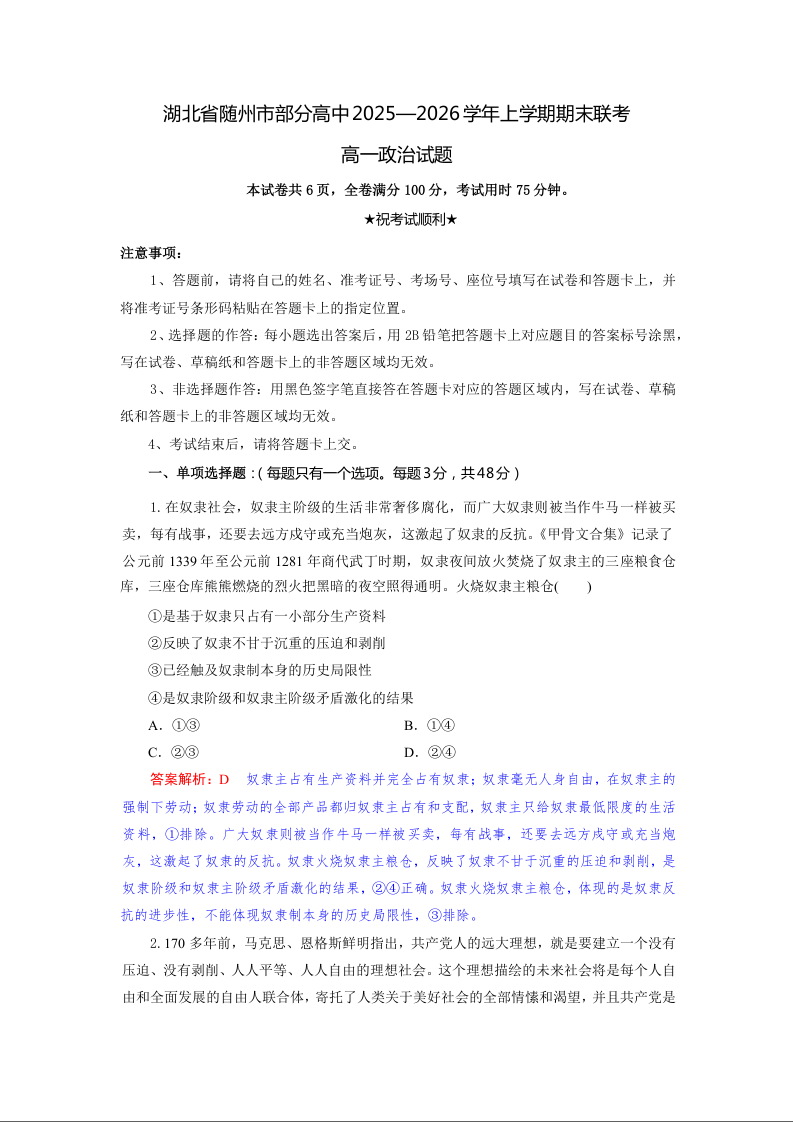 湖北省随州市部分高中2025-2026学年高一上学期期末联考 政治答案.docx