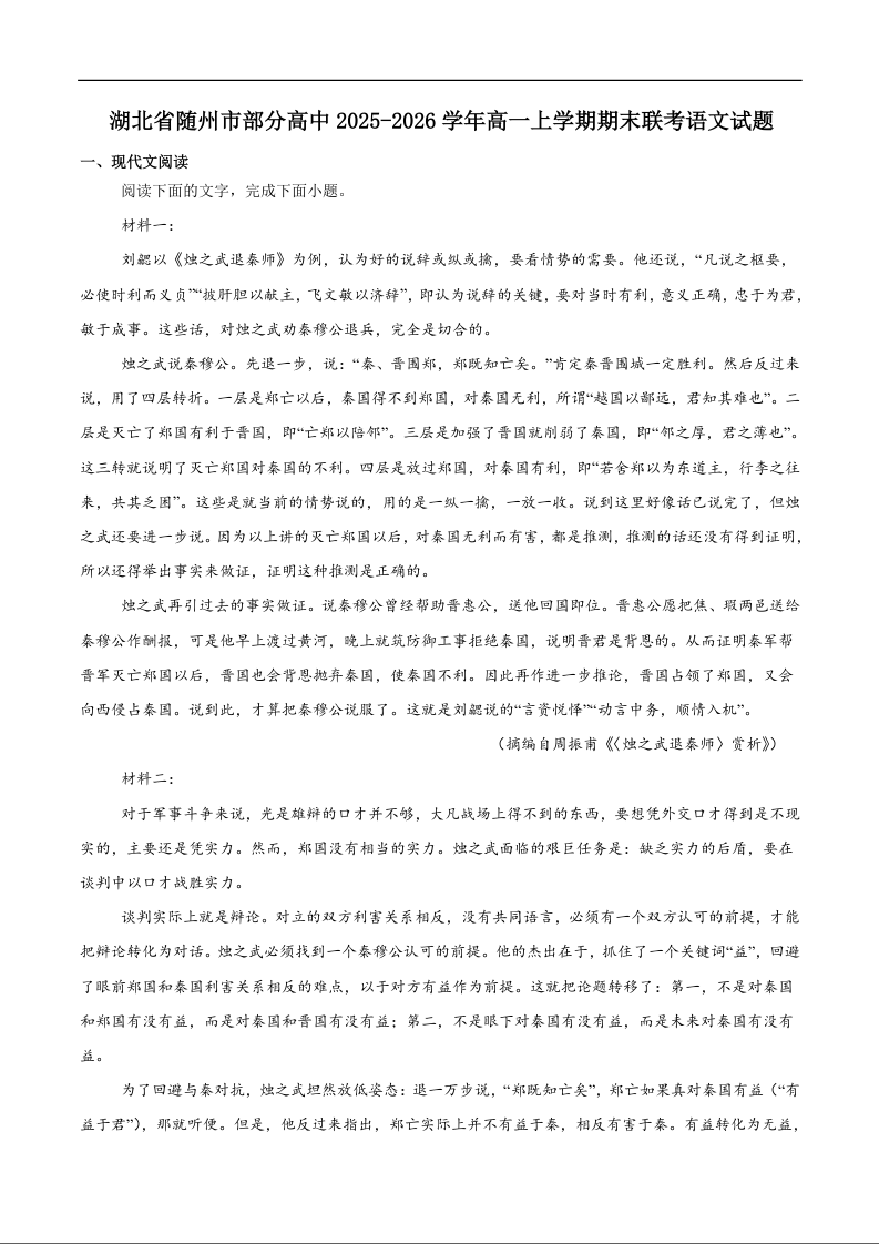 湖北省随州市部分高中2025-2026学年高一上学期期末联考 语文试题(含答案).docx