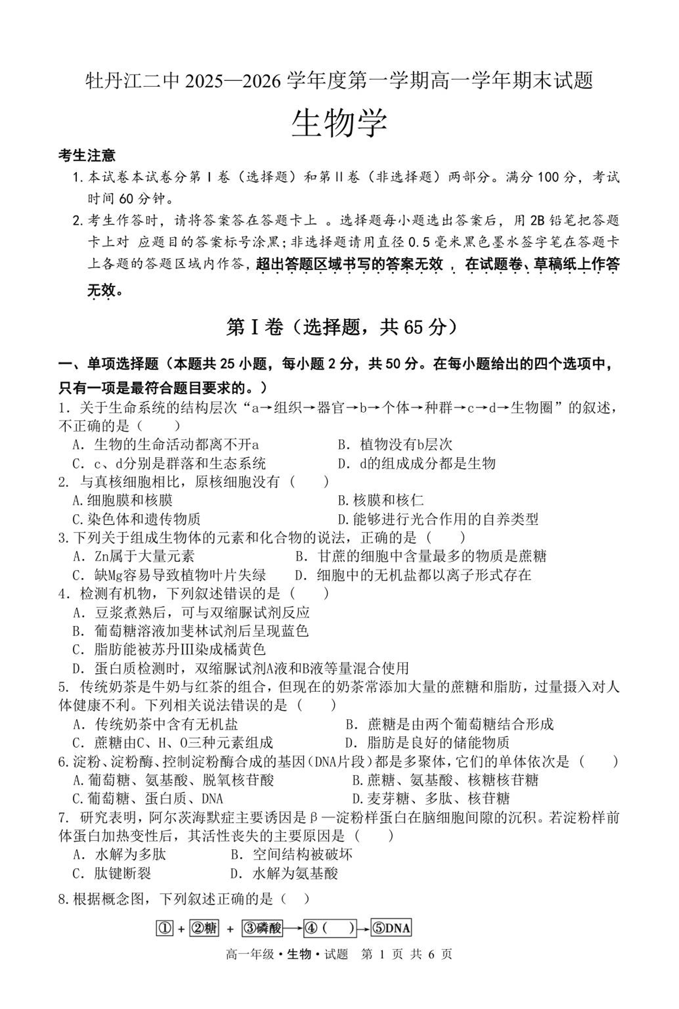牡丹江市第二高级中学2025-2026学年高一上学期期末考试 生物.pdf