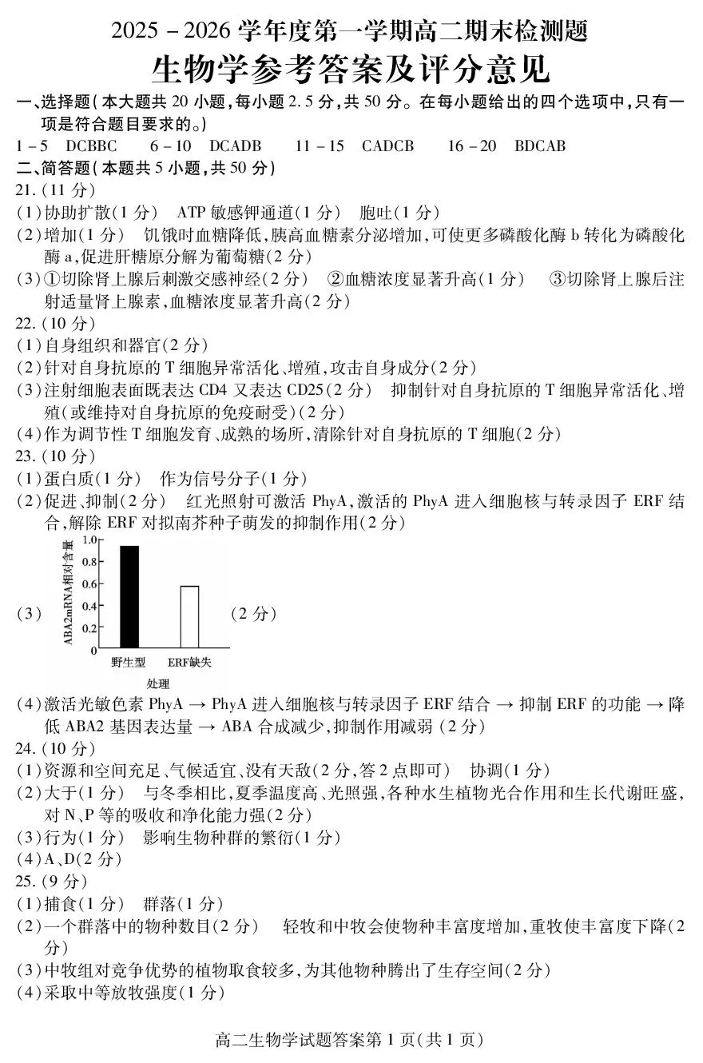 内江市2025-2026学年度第一学期高二期末检测题 生物答案.pdf