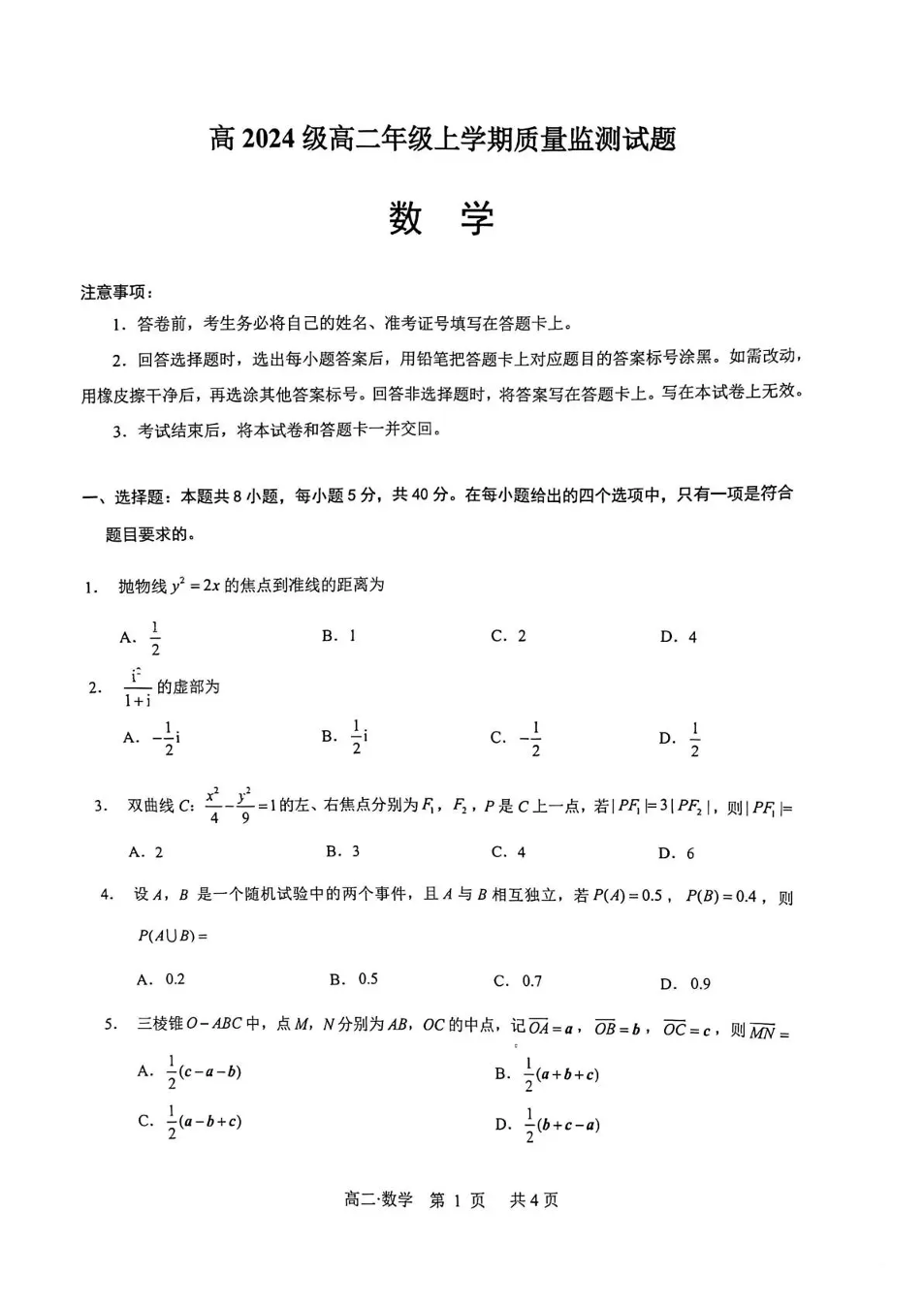 泸州市高2024级高二年级上学期质量监测试题 数学.pdf