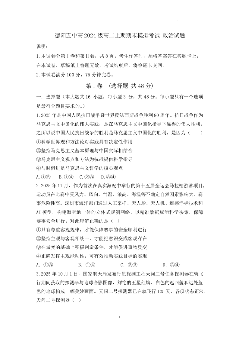 四川省德阳市第五中学2025-2026学年高二上学期1月月考 政治试题(含答案).docx