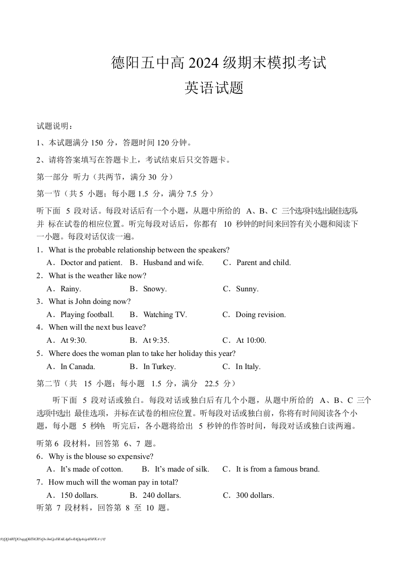四川省德阳市第五中学2025-2026学年高二上学期1月月考 英语试题(含答案).docx