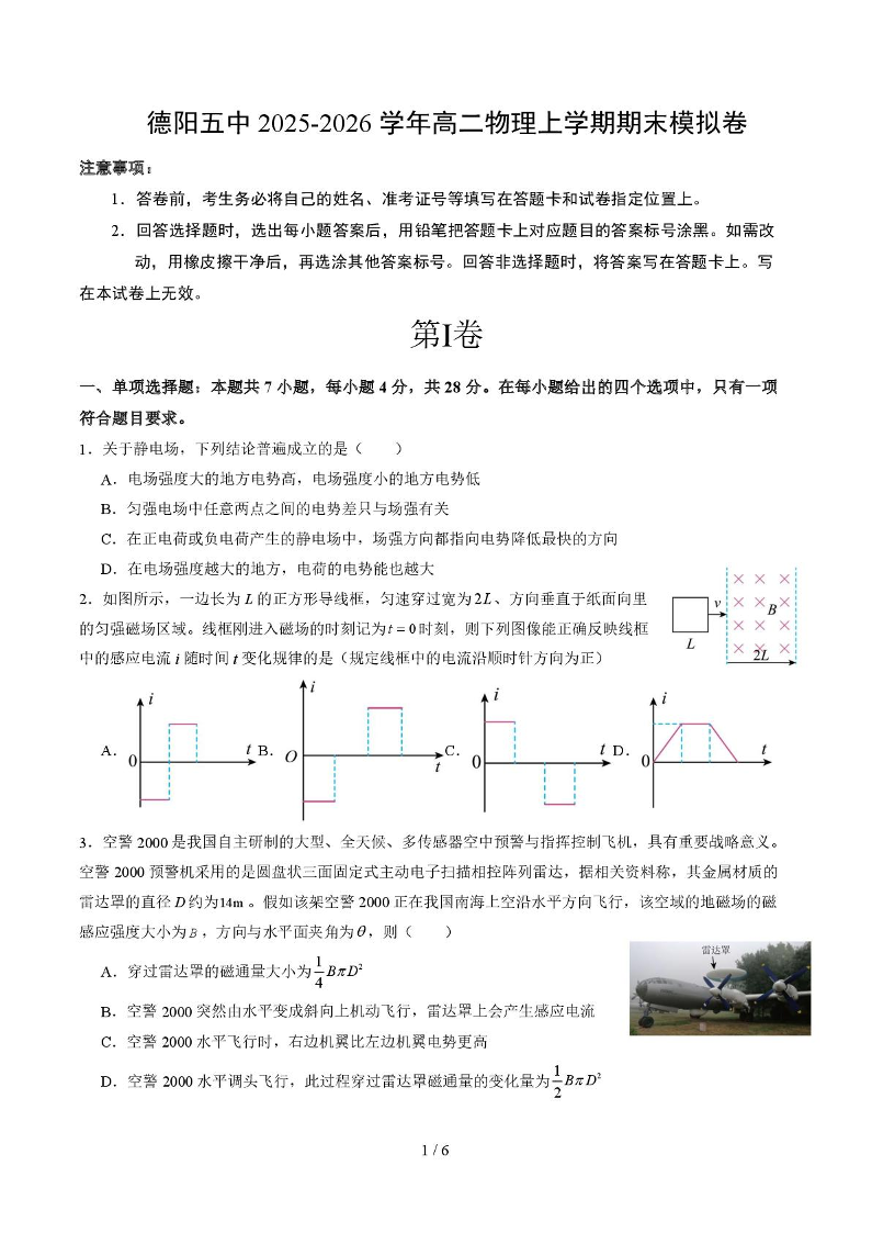 四川省德阳市第五中学2025-2026学年高二上学期1月月考 物理试题(含答案).pdf