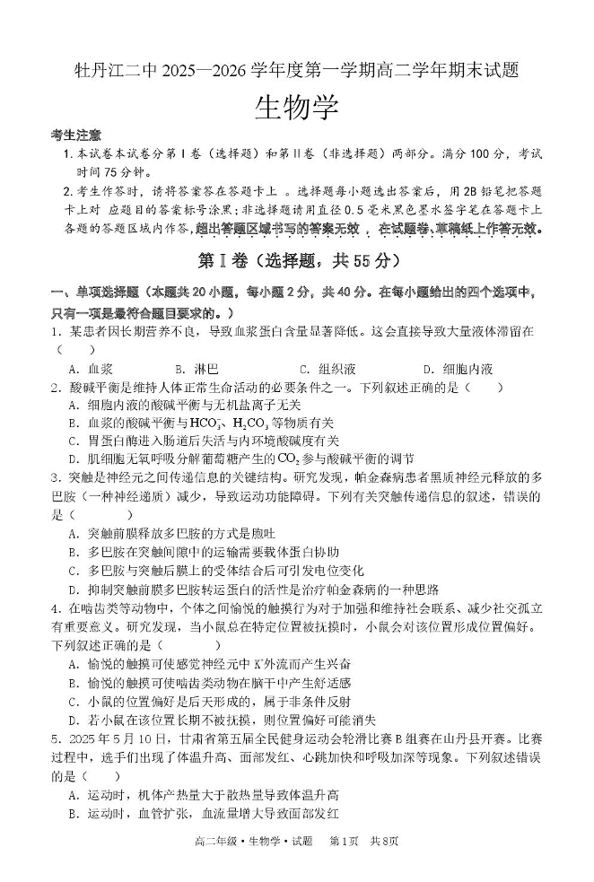 牡丹江市第二高级中学2025-2026学年高二上学期期末考试 生物.pdf