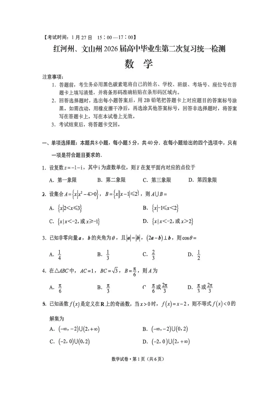 红河州、文山州2026届高中毕业生第二次复习统一检测 数学试题(含答案).pdf