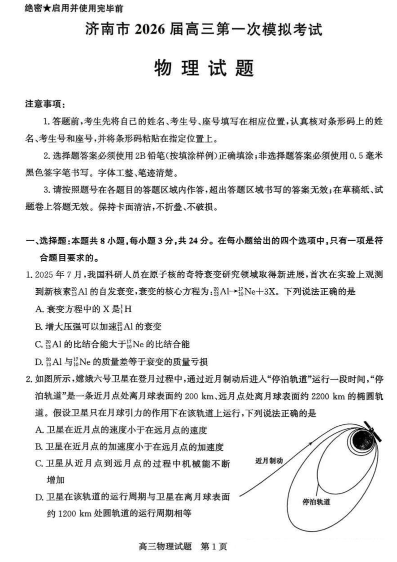 山东省济南市2026届高三第一次模拟考试暨上学期期末考 物理.pdf