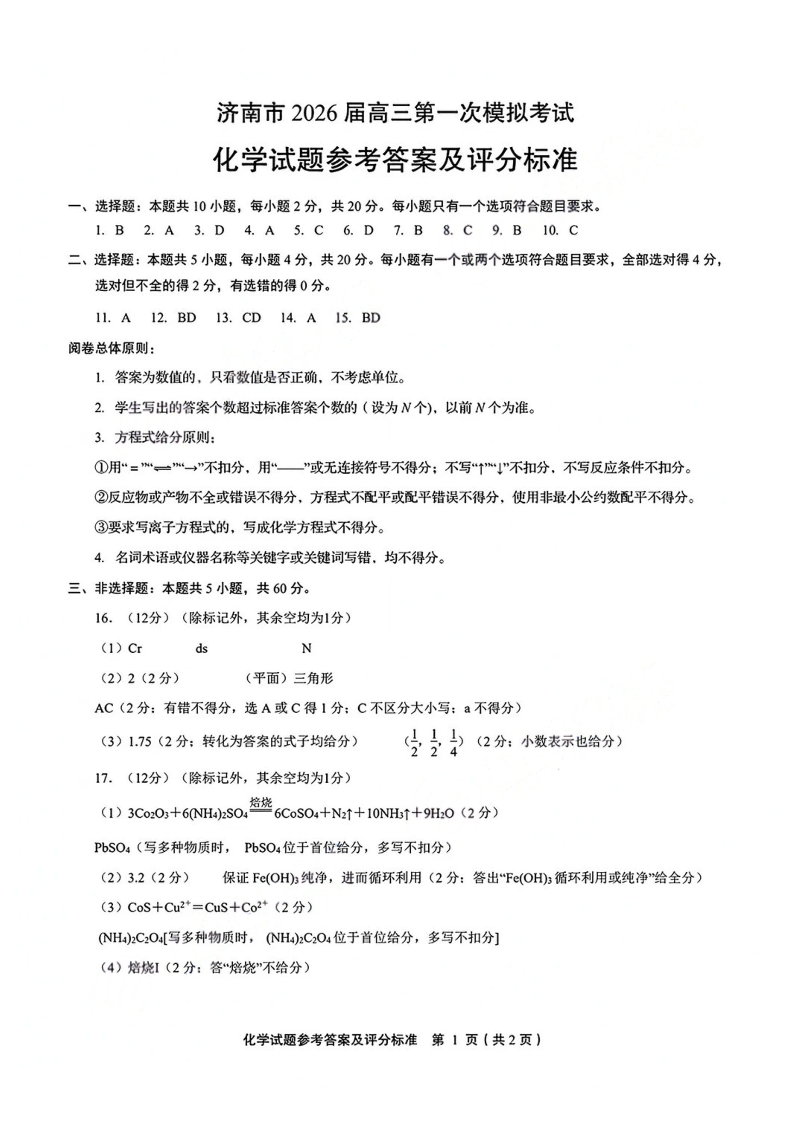 山东省济南市2026届高三第一次模拟考试暨上学期期末考 化学答案.pdf