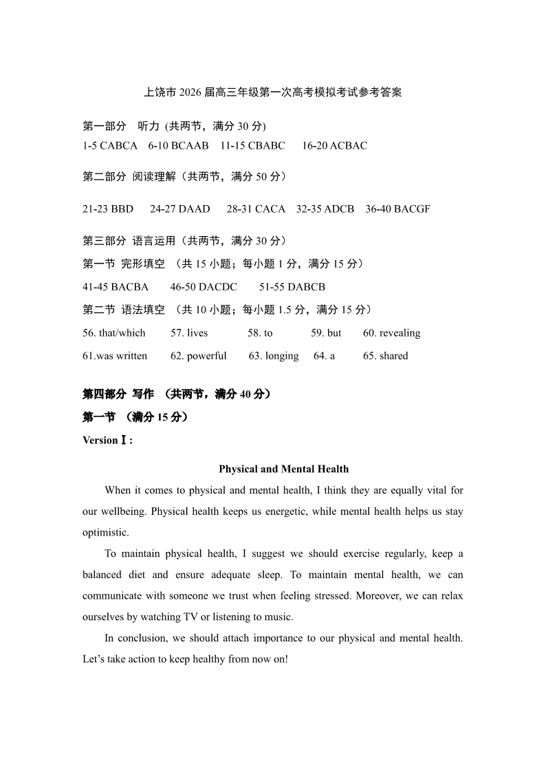 上饶市2026届高三年级第一次高考模拟考试 英语答案.pdf
