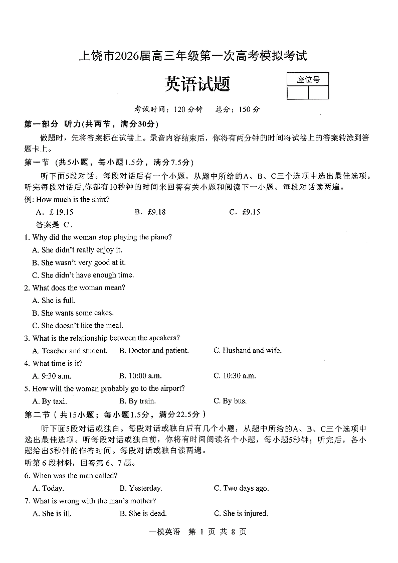 上饶市2026届高三年级第一次高考模拟考试 英语.pdf