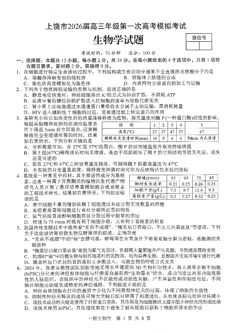 上饶市2026届高三年级第一次高考模拟考试 生物.pdf