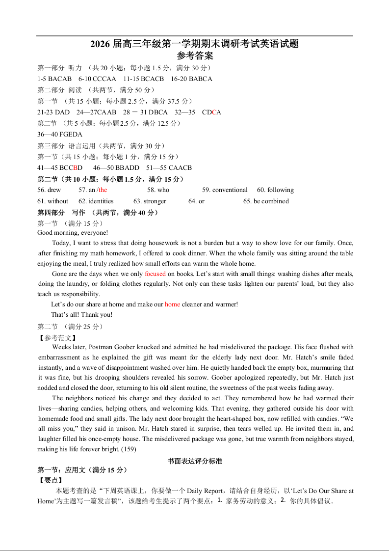 2026届高三年级第一次调研测试 英语答案.docx