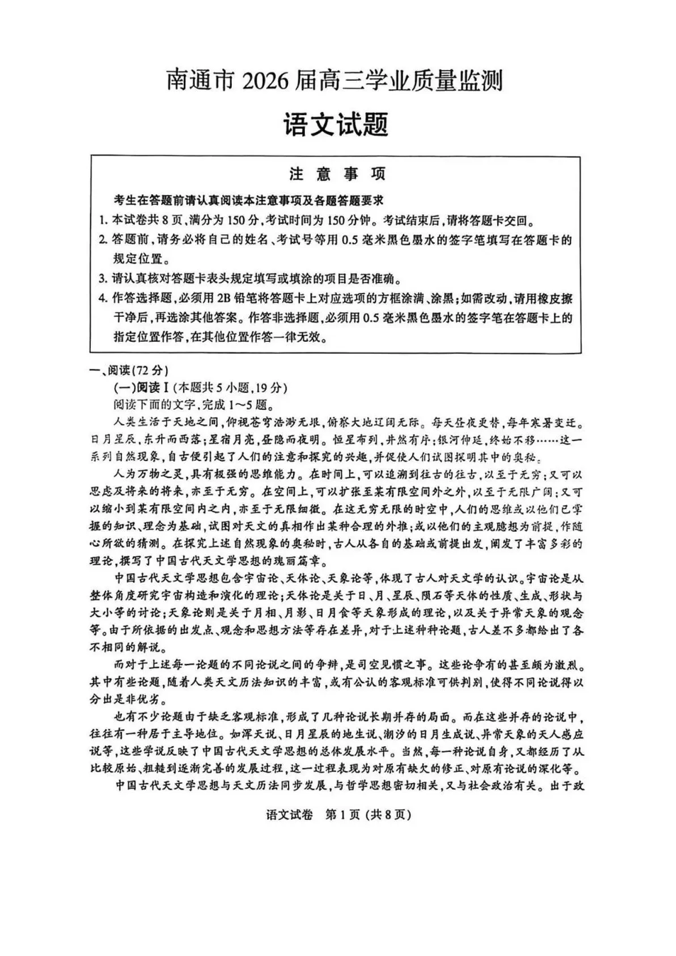 江苏省南通市2026届高三上学期学业质量监测 语文试题(含答案).pdf