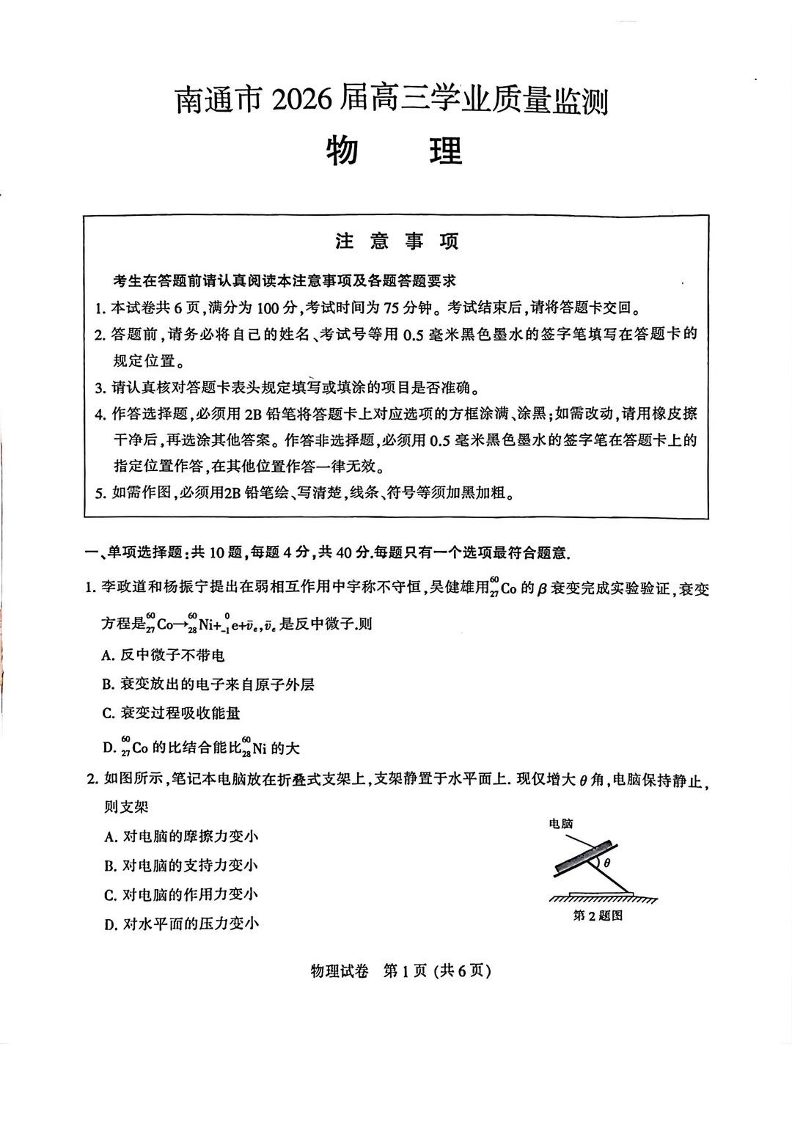江苏省南通市2026届高三上学期学业质量监测 物理试题(含答案).pdf